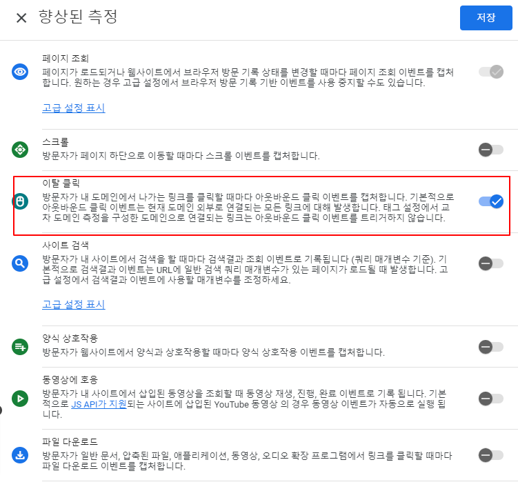 이탈클릭을 활성화 하고 나머지는 비활성화시키고 저장을 한다.