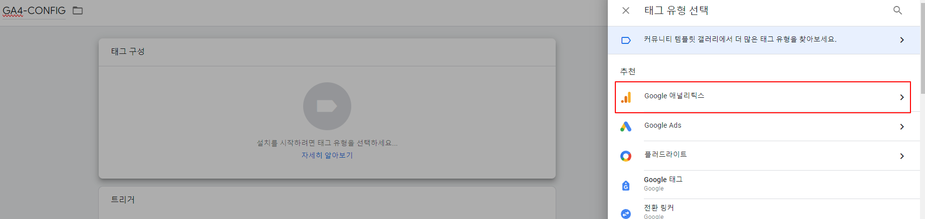 이름을 GA4-CONFIG로 입력하고 태그 유형을 클릭한다.