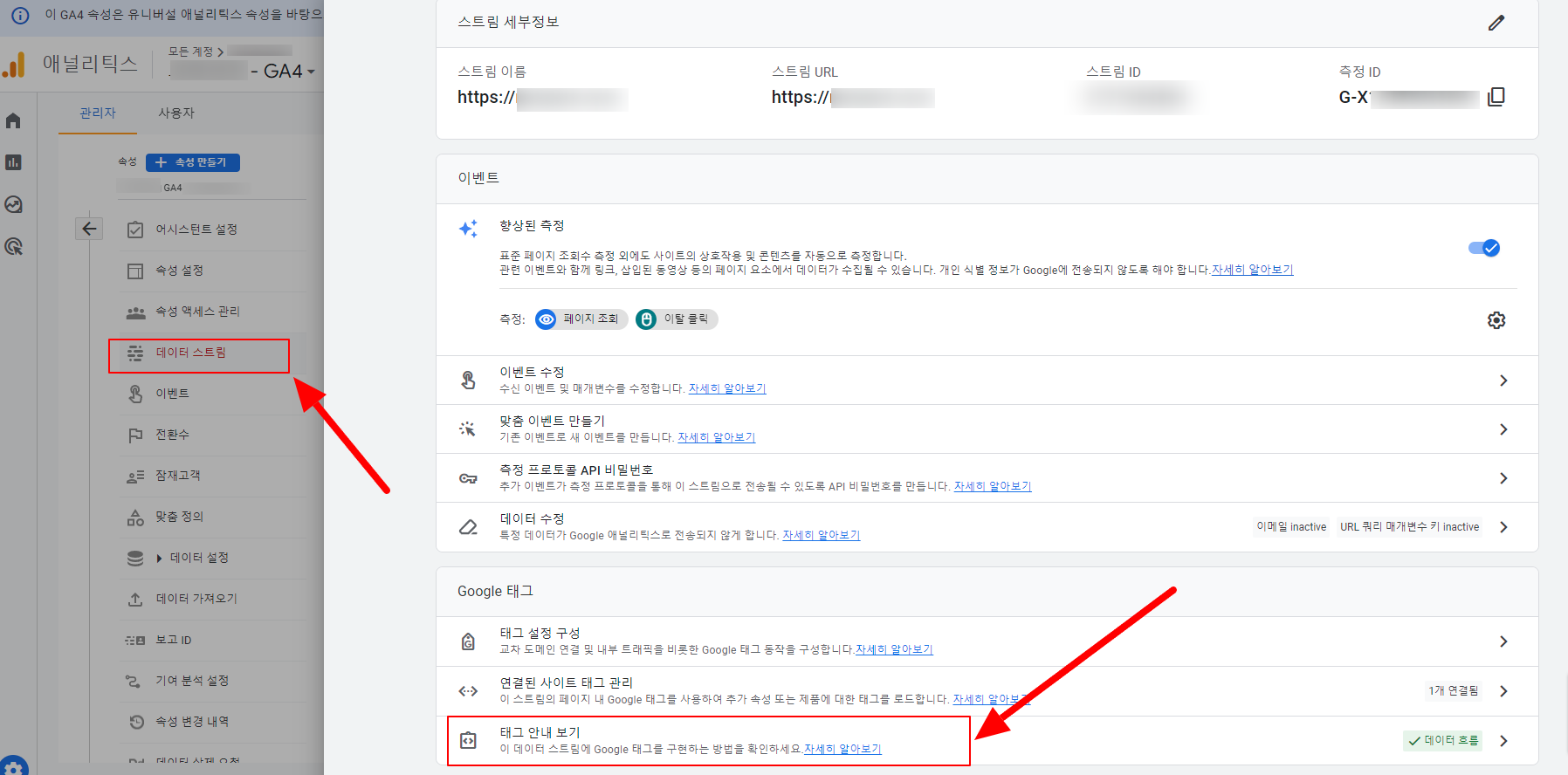 데이터 스트림을 클릭하여 나오는 화면에서 제일 아래 태그 안내보기를 눌러서 들어간다.