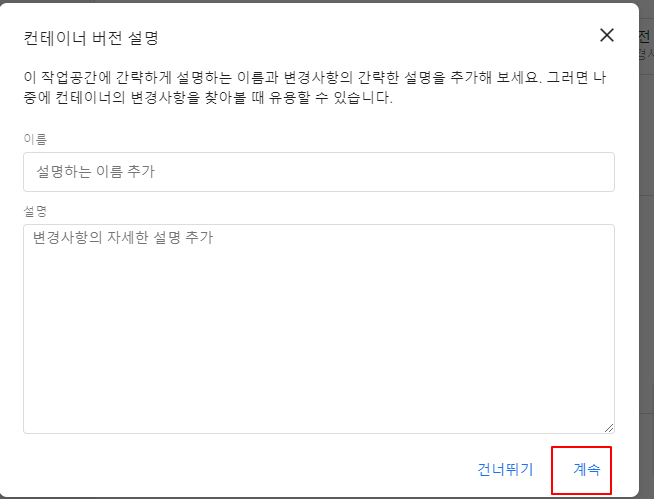 게시 버튼을 누르면 컨테이너 버전 설명을 입력하라고 나오는데 입력해도 되고 안 해도 된다 계속을 누른다.